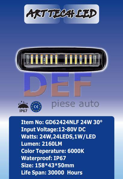 Proiector LED GD62424NLF 24W 30° Lumina alba + portocalie si functie stroboscopica. Lumina ALBA 6000K Putere: 24W Lumeni: 2160 Tensiune: 12/24V Dimensiune: 158*43*50mm Pret pe bucata. GARANTIE: 6 LUNI Acest model are trei fire (1 fir negru, 1 fir rosu si 1 fir galben): 1. conectați firul negru + roșu se aprinde alb 2. conectați din nou negru + roșu se aprinde intermitent (flash) lumina alba, 3. când conectați firul negru + galben se aprinde portocaliu 4. conectați din nou negru + galbense aprinde intermitent (flash) lumina galbena  , |